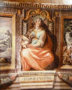 Quanto alle figure allegoriche, presenti tra i riquadri con i mesi, credo si possano attribuire a Baldassarre Croce, nonostante il pesante restauro degli anni ’50 che ne rende mediocre la lettura, sia per la sua stretta collaborazione in quegli anni con Ligustri, sia per gli stringenti confronti con altre opere simili del bolognese. Già nel 2000 la Guerrieri Borsoi aveva fatto il suo nome per il fregio in questione, paragonandolo a quello della Sala delle Muse nella Villa Sora a Frascati e datandolo al tardo Cinquecento, in epoca sistina; come di consueto, anche in questo caso sono presenti due mani una per i paesaggi e una per le figure.[26] Queste ultime da mettere a confronto con le Virtù del salone grande di Villa Montalto alle Terme, come già ipotizzato da Bevilacqua[27]. Si ricordino anche le Virtù in Palazzo Barberini, firmate da Croce. Le maestose allegorie femminili del nostro fregio presentano un forte senso tridimensionale collocandosi nello spazio di ¾ quasi emergenti rispetto alla parete. Un precedente può vedersi nella Sala delle Muse di Villa Lante a Bagnaia, opera attribuita dalla Brugnoli a Raffaellino da Reggio, databile poco prima del 1578[28] e nel fregio con paesi del Palazzo della Cancelleria sempre di Ligustri.[29] Facendo riferimento a quanto evidenziato con dovizia di esempi dalla Cavazzini sulla tipologia dei rapporti tra committente e artista, si può dedurre che il committente si comportasse come era consuetudine: pochi risultano i contratti tra il committente e gli artisti affermati a confronto con i ben documentati lavori edilizi. Contratti si trovano talvolta con artisti di secondo piano, con decoratori, doratori ed artigiani. La studiosa ha rilevato che i contratti con gli artisti erano pochi, prevalendo le intese verbali. Per interventi di una certa importanza non si potevano stabilire patti precisi così come la cifra da pagare. L’esempio più evidente riguarda i soffitti affrescati in palazzo Patrizi di cui ignoriamo i costi mentre i nomi degli artefici non compaiono nelle “uscite”. In genere la somma da sborsare veniva decisa dopo la “misura e stima” di periti di parte [30].