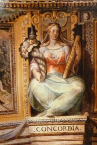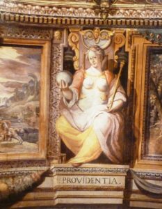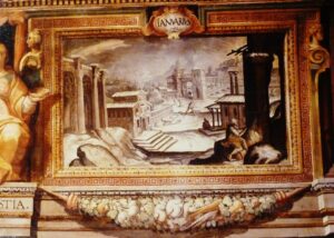 A questo punto, stabilita la cronologia del fregio agli anni 1584-1586, si possono avanzare delle ipotesi attributive nuove per i paesaggi e per le figure allegoriche. Tra i precedenti iconografici presenti a Roma in questi anni, si trovano i modesti paesaggi con piccole figure opera dello sconosciuto Ercole Perilli (1576-1582) presenti su un lato del Palazzo del Commendatore nell’Ospedale di Santo Spirito in Saxia; negli ultimi due anni l’artista dipinse anche due fregi in ambienti interni, uno con Storie Sacre ed uno con le Stagioni : l’Inverno è raffigurato come un vecchio che si riscalda presso il fuoco, tra rovine coperte di neve, come poi si ritrovano nella Stanza dei Mesi. Negli anni 1588-1591 gli affreschi al Santo Spirito vennero proseguiti sui lati orientale e occidentale dal marchigiano Cesare Conti (1550c-1622), attivo anche nella vicina chiesa (1576-1590)[14]. Leit-motiv delle decorazioni di epoca sistina sono poi le figure allegoriche, presenti nei fregi: è molto probabile che girassero cartoni riutilizzati in diversi cantieri perché le figure hanno forti somiglianze tra loro: si vedano ad esempio le allegorie della Loggia del Palazzo Lateranense e della Sala di Costantino, risalenti agli anni 1588-1589.