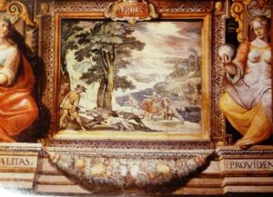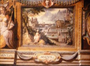 raffigura la caccia al cinghiale, braccato dai cani e dai cacciatori; la scena è certamente mutuata dal Tempesta, si veda La morte di Adone, della Galleria Sabauda, tema che il pittore, a sua volta, aveva attinto dal suo maestro Jan van der Straet e la scena di caccia nello Studiolo del pappagallo, nel palazzo Chigi di Viterbo E’ noto che Tempesta, a Roma già sul finire degli anni ’70, aveva intrecciato una stretta collaborazione con i fratelli Bril. Questo rapporto aveva visto i suoi frutti nei paesaggi del Casino Gambara a Bagnaia. Contemporaneamente Tempesta intraprendeva la sua intensa e celebrata attività di incisore, i cui temi ricorrenti sono cacce, stagioni, mesi, battaglie, sempre entro grandi aperture di paese, di chiara ascendenza fiamminga. La raffigurazione del Mese di Maggio